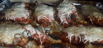 Keep chicken on pan they baked on and spoon a generous amount of red sauce over each breast. Place a handful of grated mozzarella or provolone cheese on top of the sauce. On top of the mozzarella/provolone, grate freshly grated parmensan and place on top rack of the oven. YOu can use broil if you would like the cheese to brown a bit, otherwise, bake at 375°F for about 5 minutes to melt the cheese. Remove from oven and place on plate on top of cooked spaghetti noodles. Garnish with fresh parsley and freshly grated parmesan cheese.