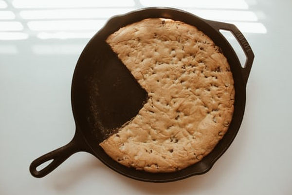 Line an iron skillet or 9″x13″ baking dish with parchment and pour the cookie dough into the dish. If using a 9″x13″ glass dish, pour it all in. If using an iron skillet, do this in 2 batches–unless you want super-thick cookie bars! Smooth out the dough and place the pan of dough in the oven to bake.