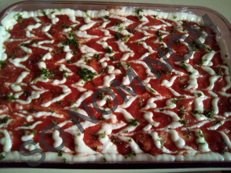 In a 9″x13″ rectangle dish,pour 1 cup of red sauce into the bottom and spread it to cover the bottom of the dish.