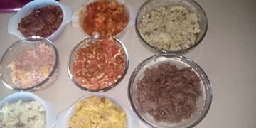 Buffalo chicken (Fried chicken strips, coated in buffalo sauce and chopped)
