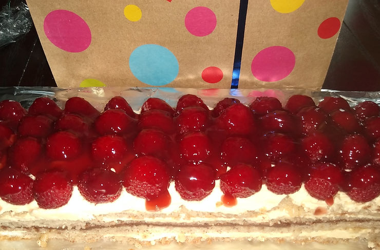 To assemble, slice the 13″ x 9″ cooled cake the entire length of the cake horizontally so you have two 13″x9″ cakes. Cut each of the sponges in half vertically, so that you have four cakes total. You should have four (13″ x 4.5″) cakes.