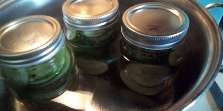 Place filled, closed jars of cucumbers and juice into the pot of boiling water. Fit as many as you can. Water should rise to the top of the jars. Boil 10 minutes and remove from water. Place on counter to cool. Jars will be hot, use canning tongs or a potholder to remove jars. Let stand and cool. Lids will pop and seal to ensure freshness