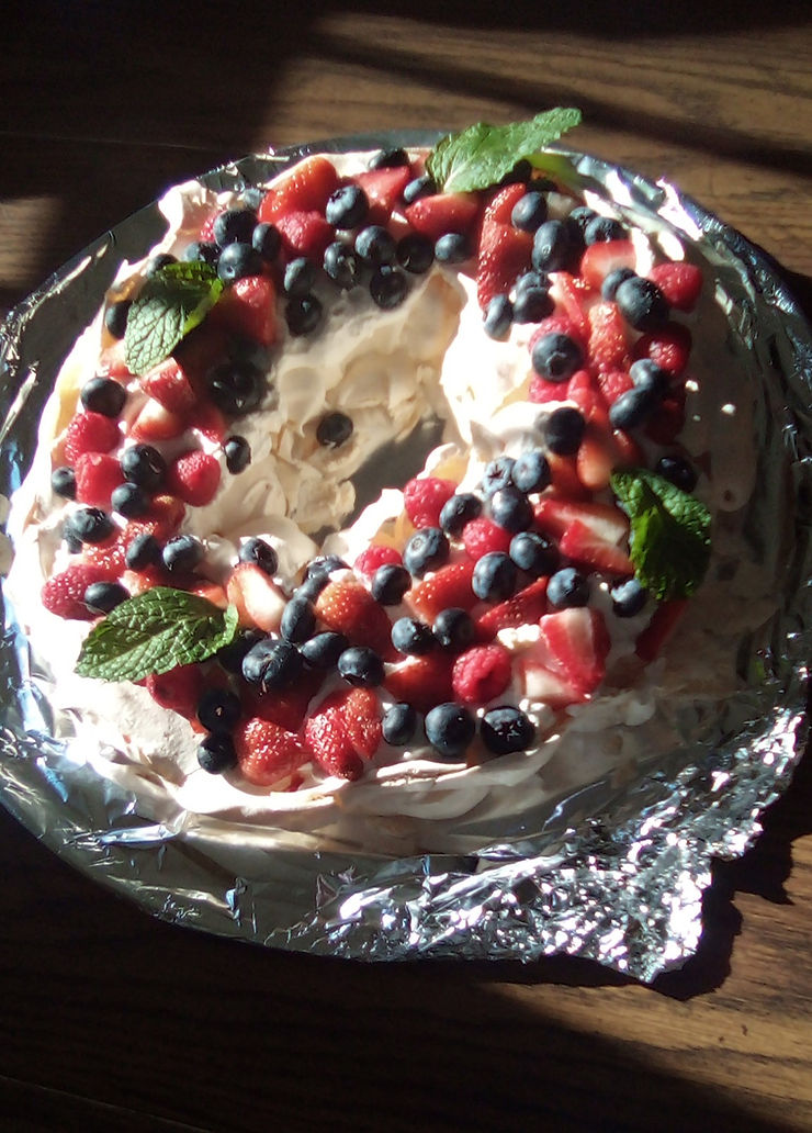 This is a very special dessert! What a beautiful addition to compliment any dessert table! Crisp, sweet meringue, filled with fresh whipped cream and fruit is a wonderful balance of sweet and refreshing. #Sonomnom4u #Pavlova #Vegetarian