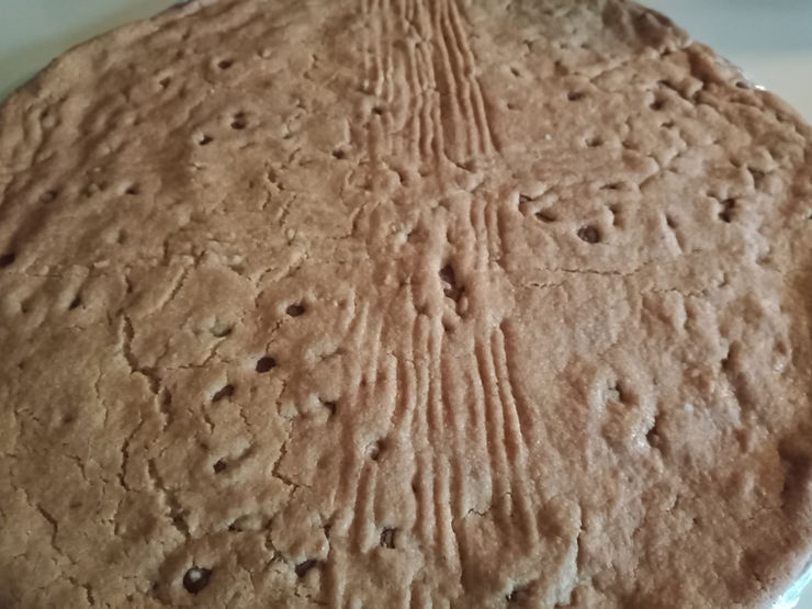 Dump all the dough on the pan or in the sprayed, lined dish and spread evnly. If using a pizza pan, leave about an inch all around. The dough will expand as it bakes.