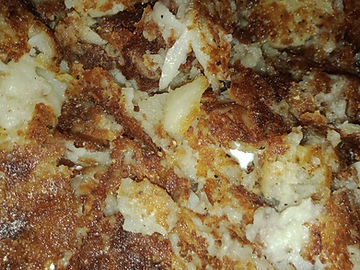 Heat 1/4 cup of oil in a large well-seasoned iron skillet (or non-stick pan) Iron skillet works the best. when the oil is hot enough that water sizzles when you place a drop of water in it, add the grated potatoes. Smash them down gently so there are no holes showing. Don’t over-smash! Cook them for at least 5 minutes. Gently check the other side by lifting it with a spatula on the edge a tiny bit.