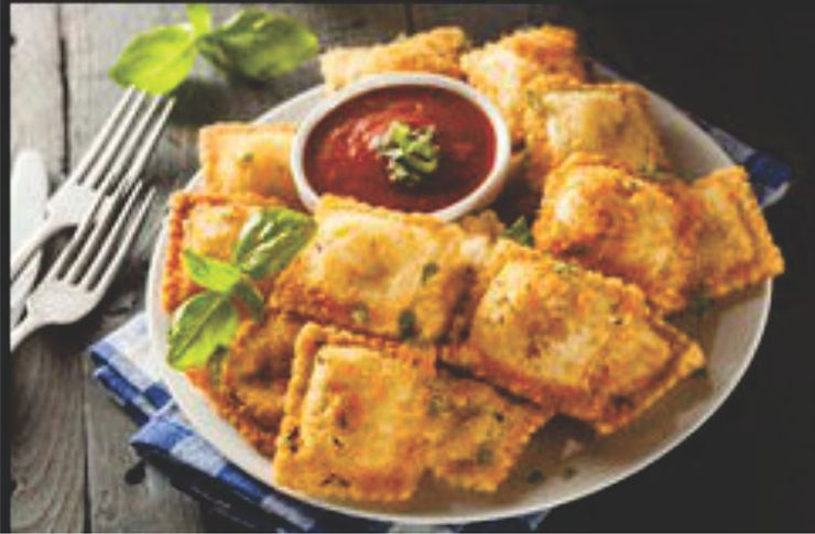 Follow that step until all raviolis are coated with egg wash and bread crumbs. Freeze on a parchment lined baking sheet. When all frozen, place them in a large zipper bag until ready to fry. When ready to fry: place all coated raviolis in a deep fryer heated to 425°F and fry approximately 3-4 minutes, flipping and stirring regularly until golden and crispy. Drain on paper towels or cooling rack over paper towel. Sprinkle with parmesan cheese and serve hot with red sauce.