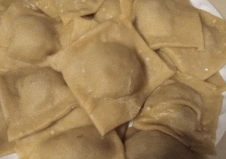 If you made machine dough strips, place a spoonful of meat 2 inches apart, spray with water and place an empty strip on top. Seal with finger and cut into individual raviolis. Place on parchment lined baking sheet in a single layer. Freeze until frozen solid.