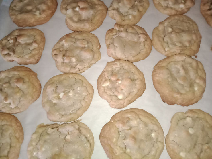 In a separate bowl, mix flour, baking soda and salt. Add Flour mixture slowly while the mixer is on. (We use the flour guard to avoid a huge mess!) when all flour is added, turn off mixer and pour in white chocolate chips and macadamia nuts. Mix another minute or so.