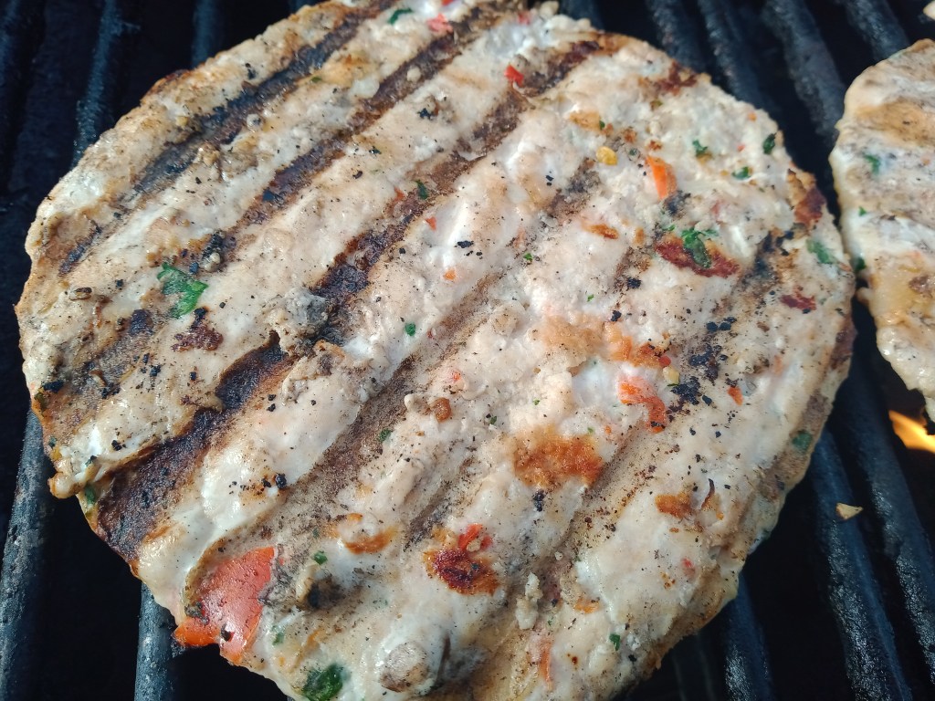 I like to layer them on a plate with parchment between. If you have time, place the plate of layered burgers in the freezer so they can chill a bit, and even freeze. These are easier to cook when they are half-to full frozen! These cook better in a skillet or griddle, but can be grilled. Just DON’T FLIP THEM UNTIL THE FIRST SIDE IS COMPLETELY COOKED–and spray the grill rack thoroughly with oil spray prior to cooking on the rack!