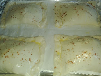 When all 4 pouches are on the parchment lined baking sheet together, use a pastry brush and brush the top of each one with egg wash. sprinkle with paprika (we use smoked) and or parsley flakes.