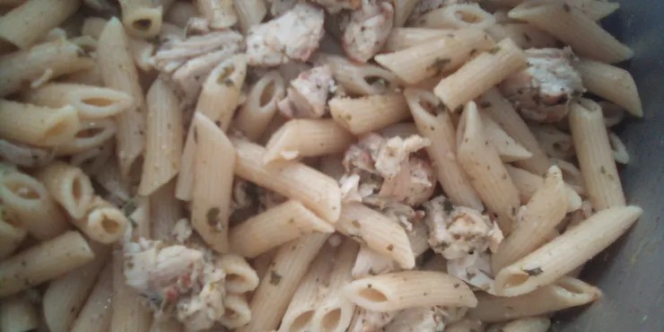In a skillet, heat olive oil, pesto and garlic. Cook for 1 minute. Add Chicken broth, and lemon juice. Add chopped, grilled chicken. Pour mixture over drained pasta. Add Freshly grated cheese, Basil, Oregano, Parsley, and Thyme. Toss to even coat pasta.