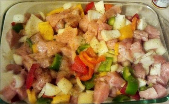 Spray a 9″x13″ baking dish with nonstick oil spray. Add all of the chicken breast, peppers, onion, and garlic, olive oil and seasoning to the baking dish. Toss until everything is dispersed, mixed and coated evenly with seasoning.
