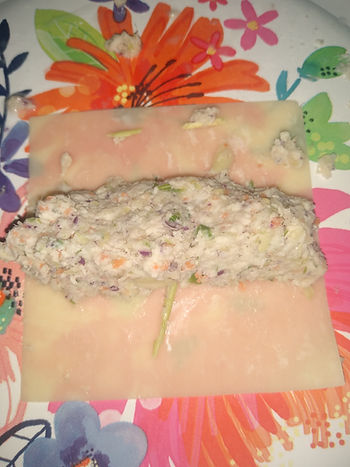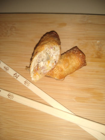 On a clean work surface, open wonton wrappers and place one on the surface. Taking a spoon, gently scoop a small amount onto the middle of the wonton wrapper. forming a tube. Make sure and pack the filling pretty tight. Take the bottom of the wonton wrapper and place it over the tube of filling and roll tightly. Dip your finger in a small bowl of water and run it across the entire length of the wonton flap before rolling it completely into place. The ends will be open but the inside will be fine in the fryer as long as you packed it tight.