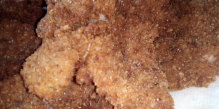 Slice a pork loin or pork tenderloin into 1″ thick slices. Place slices in a gallon zipper bag so they are flat and lying on a sturdy surface inside the bag. You can place about 3 pieces of meat in a bag at a time. leave space. With a meat mallet, beat each piece of meat until it is flat, but not so flat there are holes. Each meat slice should be about twice its original size in diameter and about 1/4″-1/2″ thick (how you prefer)