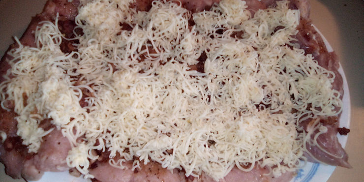 After meat is cut and flattened, place in a large zipper bag and pound it with a mallet, flip it and pound the other side, too. Remove from bag and lay on a large platter. Season one side of the meat with salt and pepper and sprinkle your stuffing choices across the entire area of the flattened meat.