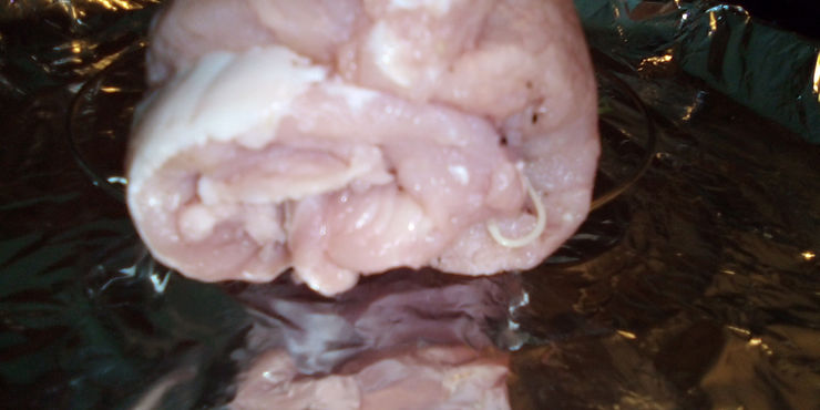 After entire area is covered with your choice of stuffing, take one end and roll the meat and stuffing up tightly. You can use cooking string or toothpicks to secure the end down.