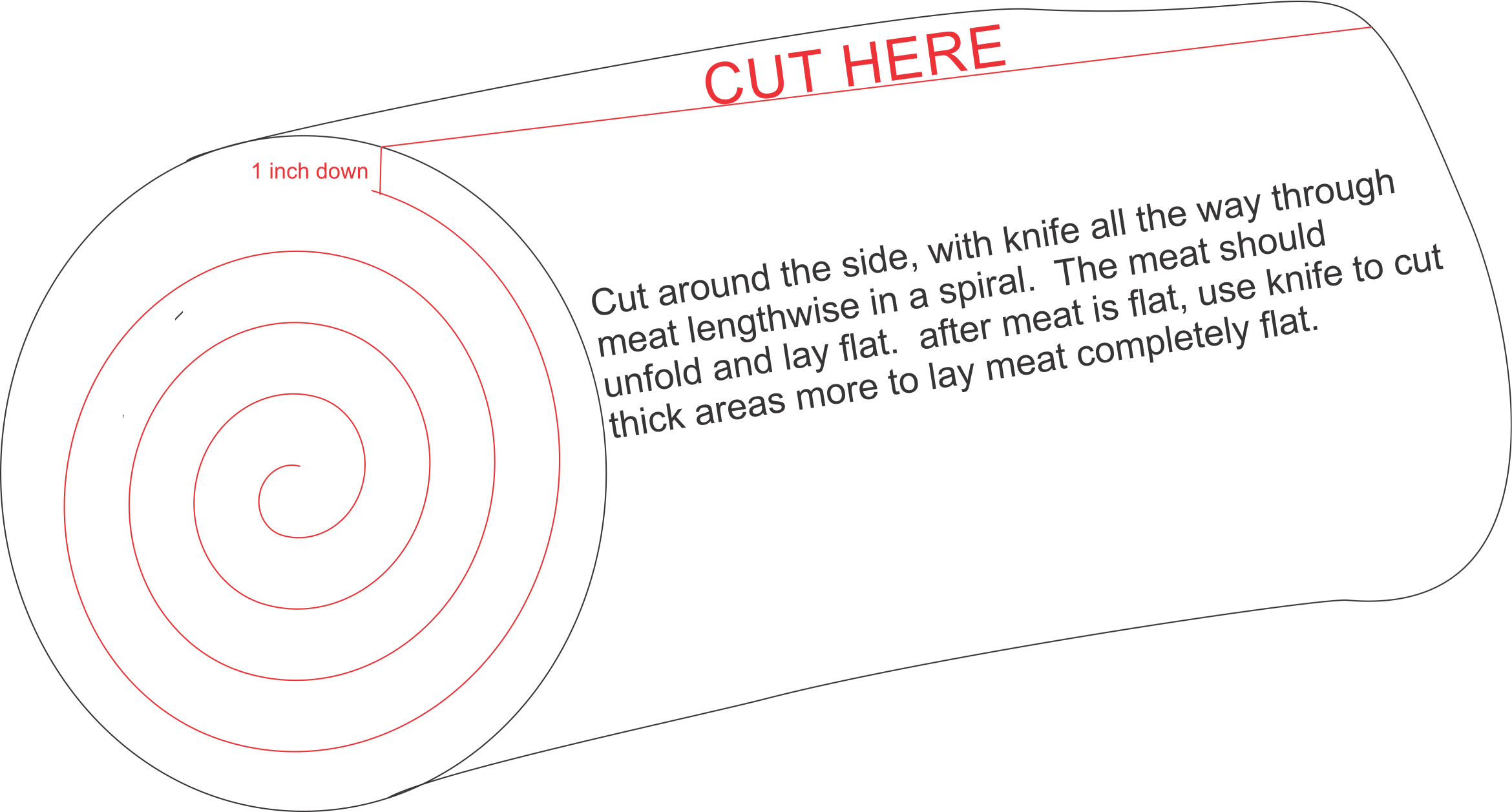 Take the pork loin roast, and using a knife, carefully make a slit across the top of the roast lengthwise. insert knife about an inch deep all the way across the top. Now, with knife still in the topuse knife to turn right or left and with knife about an inch deep, cut as shown in image below.