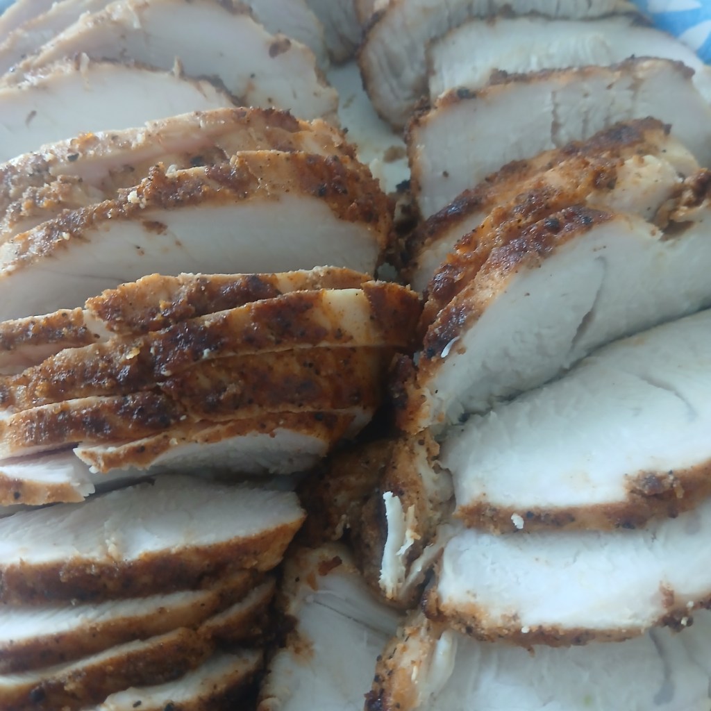 Spray an iron skillet with oil and heat on medium high. Place both pieces of turkey in hot pan and sear all sides.
